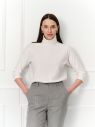 Белый однотонный джемпер в широкий рубчик с рукавами реглан длиной 7/8 и высоким воротником - отличная база под жакет. Дышащий трикотаж хорошо сохраняет тепло, обеспечивая оптимальный микроклимат. Лаконичная модель не ограничивает движение и плотно облегает шею. Джемпер сочетается со многими моделями брюк из осенней коллекции.