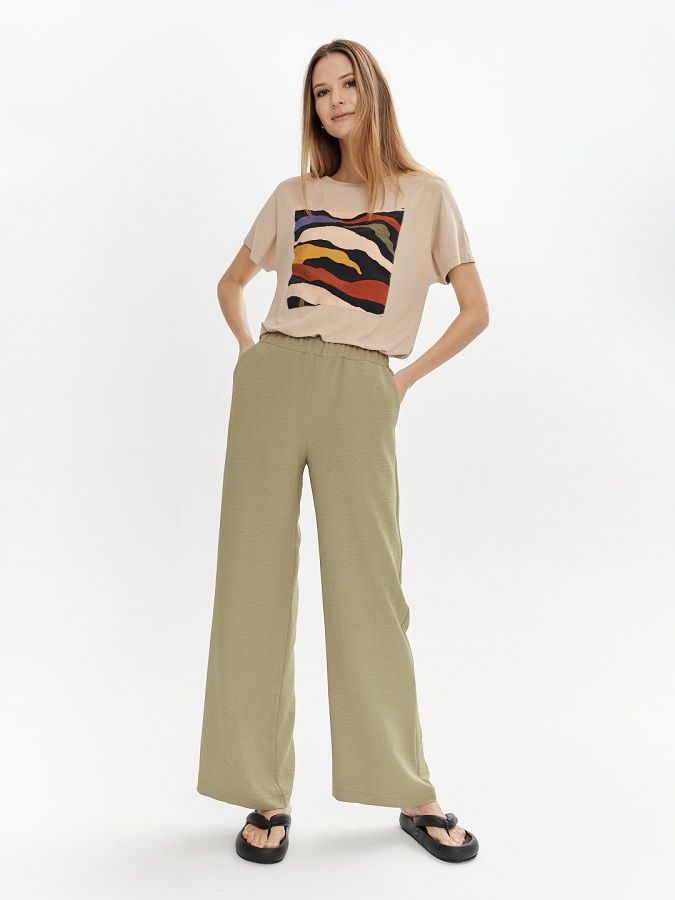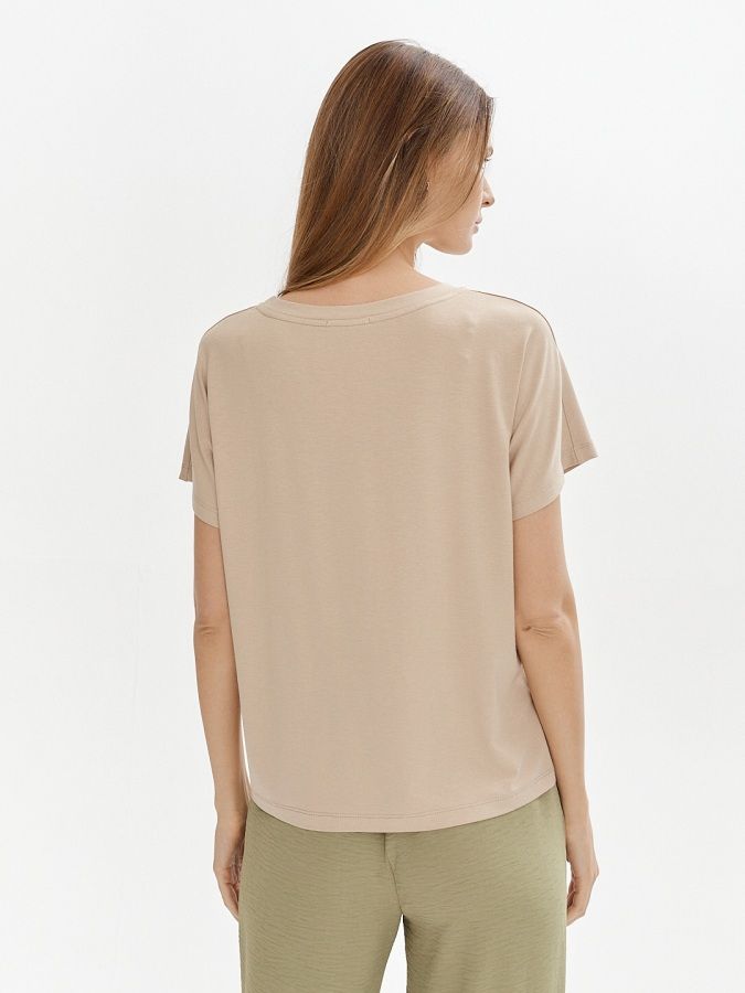 Бежевый джемпер с короткими цельнокроеными рукавами украсили крупной нашивкой, напоминающей экспонат выставки прикладного искусства. Для пошива модели выбрали приятный на ощупь вискозный трикотаж, который пропускает воздух и комфортно облегает фигуру. Эффектная модель для лета в сочетании с брюками Б-900 СИ(В3) и блузкой Д-215 СИ(В3).