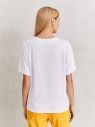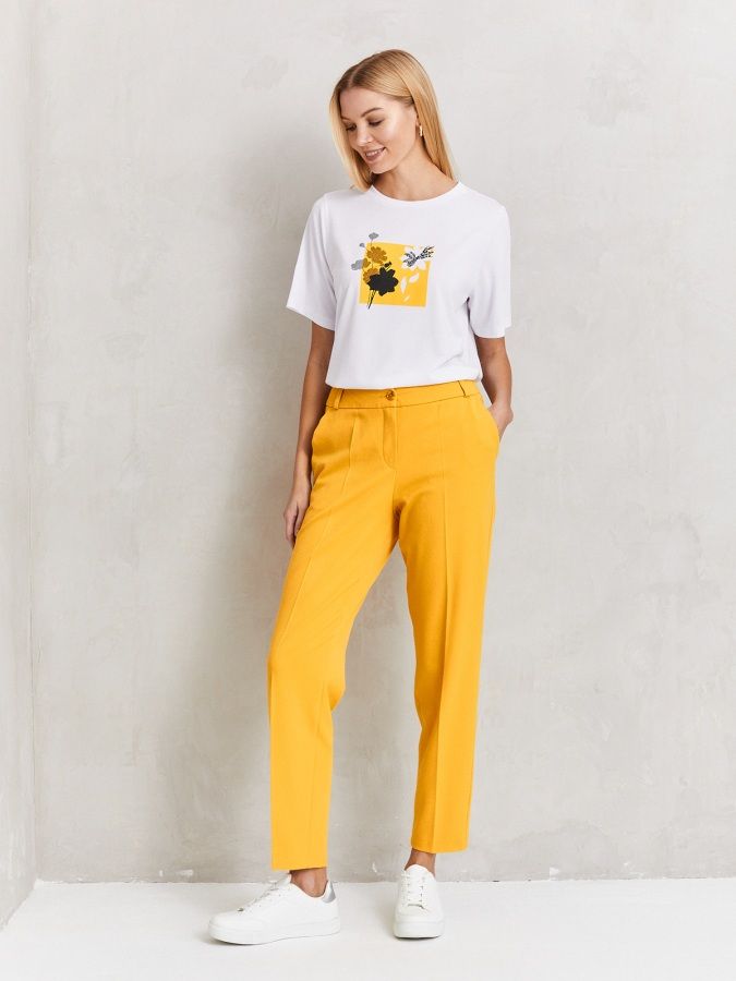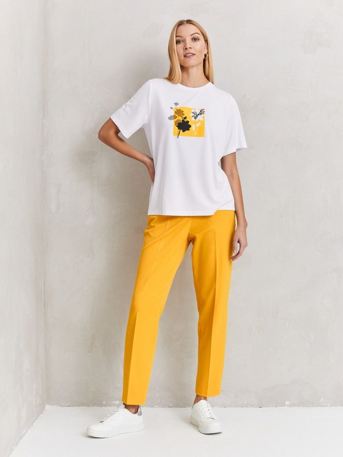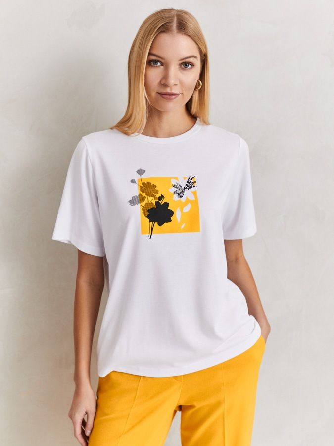 Несмотря на белый цвет, эта футболка выглядит ярко. Модель с круглой горловиной и короткими рукавами декорировали разноцветным изображением в ярких тонах от нашего дизайнера, выполненным методом прямой накатки. Изделие сшито из мягкого легкого трикотажа, хорошо пропускающего воздух и отводящего лишнюю влагу. На фото джемпер представлен с брюками Б-704 НАД(В4) и жакетом В-911 НАД(В4).