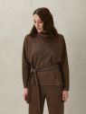 Удлиненный джемпер коричневого оттенка выглядит расслабленным за счет свободного кроя, объемного воротника-хомут и боковых разрезов. Для производства изделия использовали мягкий трикотаж в принт «елочка». В комплекте пояс для создания приталенного силуэта. На фото джемпер представлен с брюками Б-900 ЕЧК(О3).
