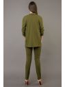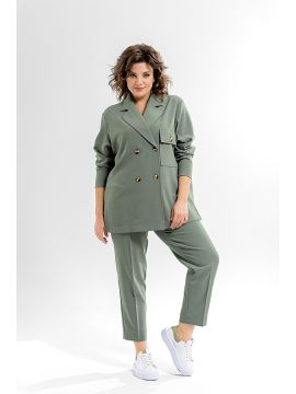 Ткань: трикотажное полотно, однотонное. Жакет свободного силуэта «оверсайз», воротник – фрачного покроя, без пуговиц, пройма немного занижена, рукав длиной ¾, со сборкой за счет подкладки в рукаве. Длина ок.71 см. Брюки узкого покроя, пояс на резинке, стрелки – застрочены, посадка – средняя, в боковых швах – косые карманы, длина по внутреннему шву ок.81 см.