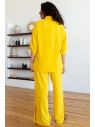 Ткань: вискоза однотонная с эффектом креш. Рубашка очень свободного покроя, линия плеча занижена, воротник на стойке, спереди застежка на пуговицы. Рукав ¾, с патой. Длина ок.71см. Брюки с высокой посадкой, пояс на резине, в боковых швах – косые карманы, книзу сильно расклешенные, по наружному боковому шву высокий разрез. Длина по внутреннему шву ок. 80 см.