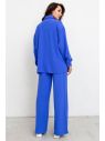Ткань: вискоза однотонная с эффектом креш. Рубашка очень свободного покроя, линия плеча занижена, воротник на стойке, спереди застежка на пуговицы. Рукав ¾, с патой. Длина ок.71см. Брюки с высокой посадкой, пояс на резине, в боковых швах – косые карманы, книзу сильно расклешенные, по наружному боковому шву высокий разрез. Длина по внутреннему шву ок. 80 см.