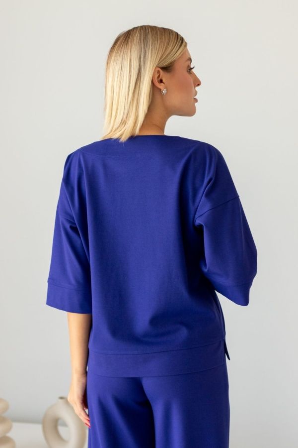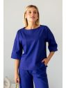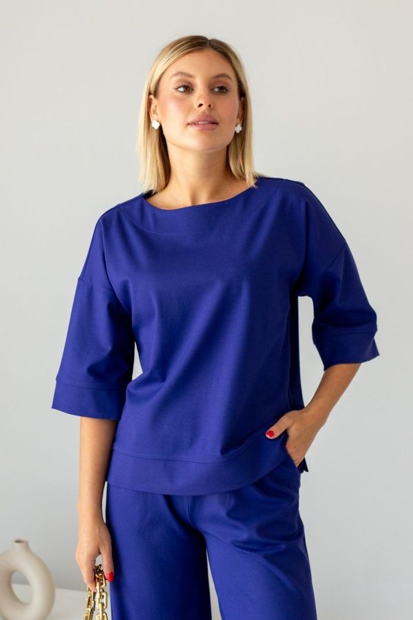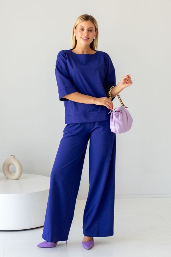 Ткань: трикотажное полотно «джерси» однотонное. Джемпер свободного покроя, линия плеча немного занижена. Рукав ¾. Длина ок 60 см. Брюки «палаццо», высокая посадка, пояс на резине, в боковых швах – косые карманы. Длина по внутреннему шву ок.80 см.