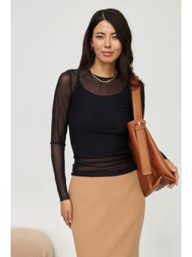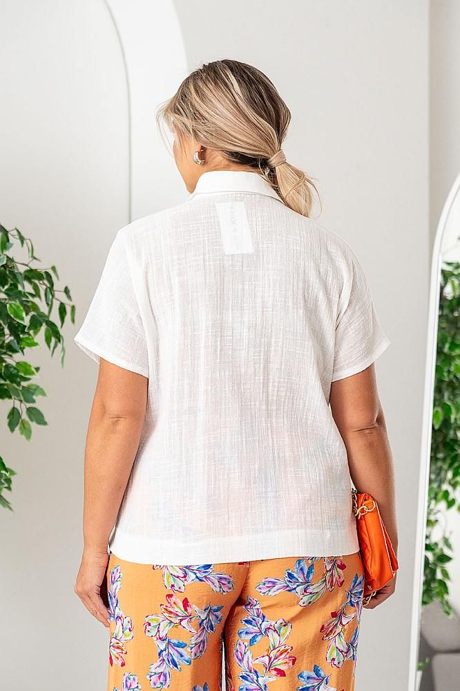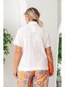 Ткань: хлопок. Блузка свободного покроя, с цельнокроеным рукавом, спереди – супатная застежка, воротник на стойке. Длина изделия ок. 64 см.