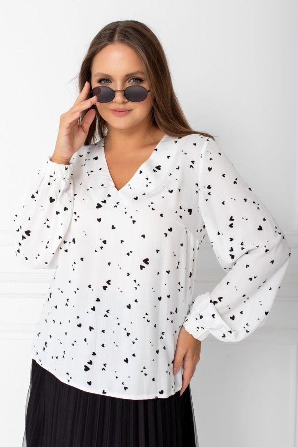 Блузка простого, свободного покроя, с V-образным вырезом,в боковых швах небольшие разрезы. Рукав длинный, втачной, не сильно пышный, манжет на широкой резине. Длина изд. ок.65см.