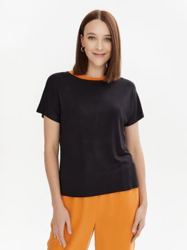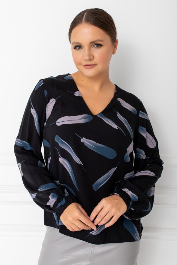 Блузка простого, свободного покроя, с V-образным вырезом, в боковых швах небольшие разрезы. Рукав длинный, втачной, не сильно пышный, манжет на широкой резине. Длина изд. ок.65см.