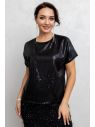 Ткань: искусственный шелк, пайетки на вискозном трикотаже. Блуза простого свободного покроя, с цельнокроеным рукавом, перед пайетки, спинка однотонная из искусственного шелка. Рукав короткий. Длина ок. 60 см.