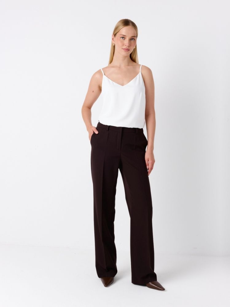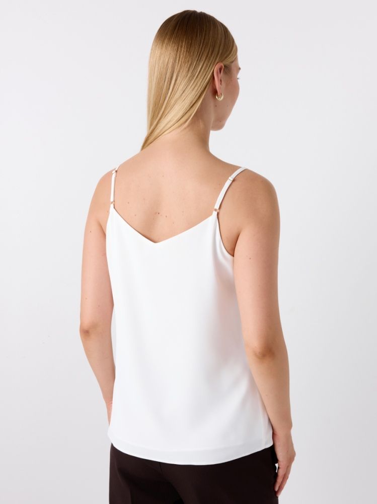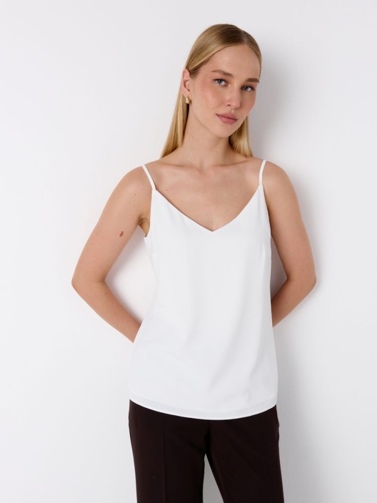 Базовый топ на тонких бретелях из матового крепа на нежном, приятном к телу шифоновом подкладе. Мягкий вырез подчеркивает зону декольте, бретели регулируются по длине, обеспечивая идеальную посадку на любой рост. Топ является отличным дополнением костюмной группы из коллекции.