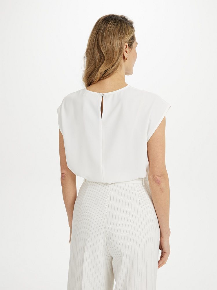 Топ из нежной шелковистой ткани. Прямой силуэт. Конструкция кимоно. Округлый вырез. Застёжка на пуговицу и петлю на спинке. По бокам небольшие разрезы. Длина до линии бёдер.