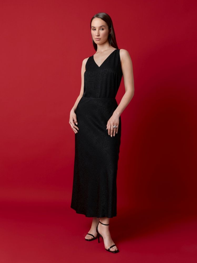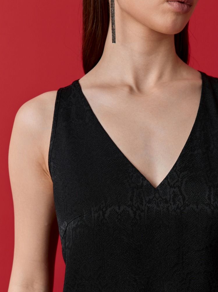 Базовый чёрный топ с V-образным вырезом – неотъемлемый элемент гардероба. Изготовленный из жаккардовой ткани с имитацией чешуи змеи, этот топ привлекает внимание своей уникальной текстурой. Жаккард – идеальный компромисс между принтом и однотонной тканью, обладающий необходимой плотностью и несминаемостью. Эта ткань придаёт изделию вечерний лоск и шик. В нашей капсуле топ комбинируется с юбкой 2.4.3-102, создавая многофункциональный образ, подходящий как для повседневных, так и для торжественных случаев.