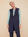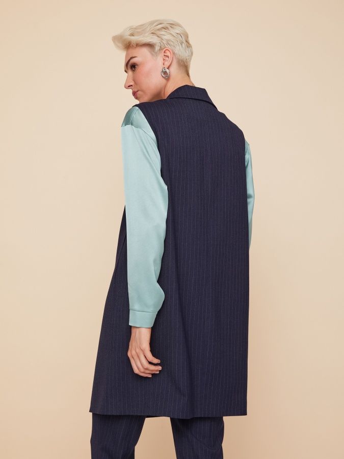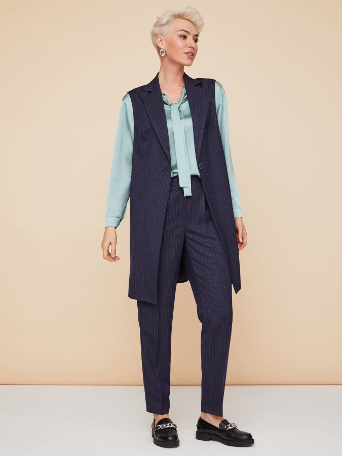 Темно-синий жилет в тонкую полоску возьмет на себя всю нагрузку в образе. За правильное настроение отвечает строгий прямой силуэт, длинные узкие лацканы и застежка на одну пуговицу. Конфигурация пройм позволяет носить жилет и с блузками, и с водолазками. Карманы в рельефных швах, длина модели до середины бёдра. Для пошива изделия на подкладке использовали поливискозную костюмную ткань, которая хорошо держит форму. На фото жилет представлен с брюками Б-802 ПИН(О2) и блузкой Д-207 ТОЛ(О2).