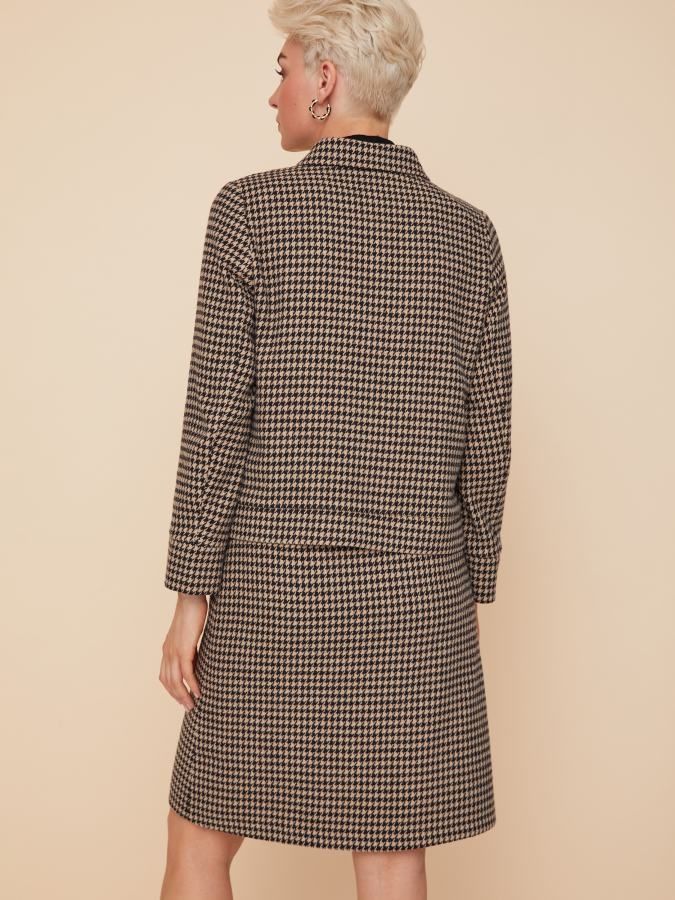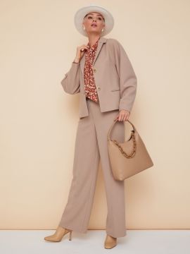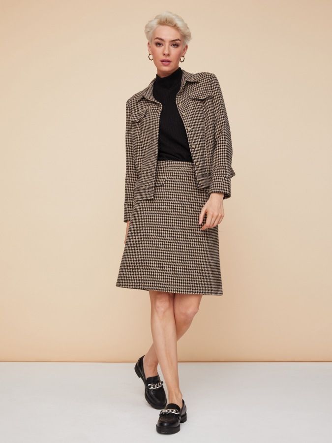 В этом жакете без подкладки присутствует эстетика 1970-х. Лаконичный крой с выраженной линией плеч, отложной воротник со стойкой, отрезные кокетки, клапана, манжет по низу. Укорочённую модель сшили из мягкого фактурного материала. Такой жакет отлично смотрится с одинаковой по настроению юбкой А-2014 СОБ1(О2) и однотонным джемпером С-13 ЧСИ(О2).