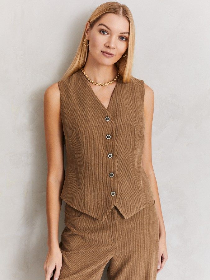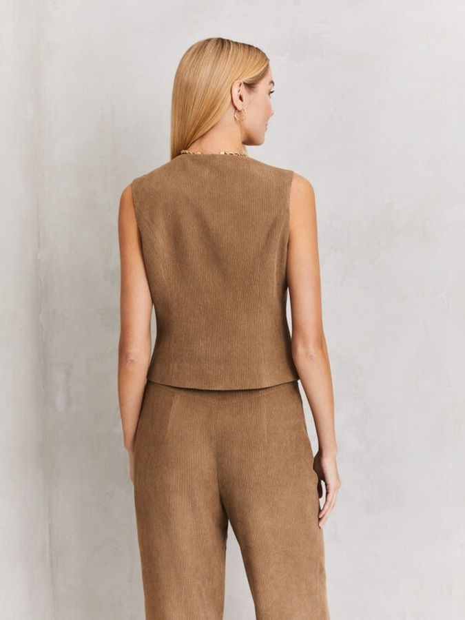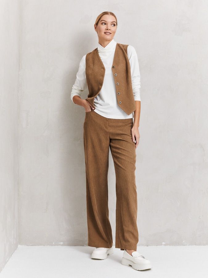 Приталенный жилет с V-образным вырезом светлого коричневого оттенка станет удачной альтернативой топу в повседневном образе или наряде на выход. Характерную для подобных моделей строгость смягчает фактура микровельвета. Изделие на тонкой эластичной подкладке, не сковывает движения. Жилет на фото представлен с брюками Б-2017 ВЛК(В4), жакетом В-911 ВЛМ(В4) и жилетом В-91 ВЛК(В4).