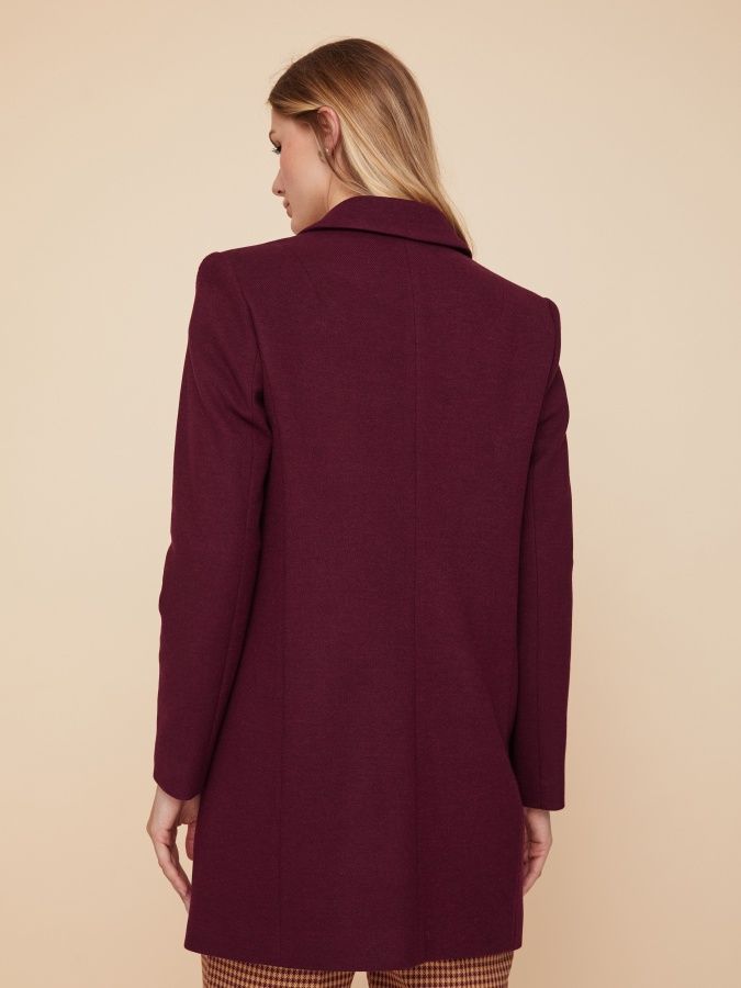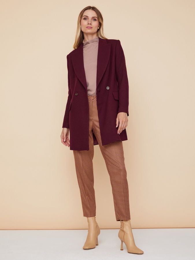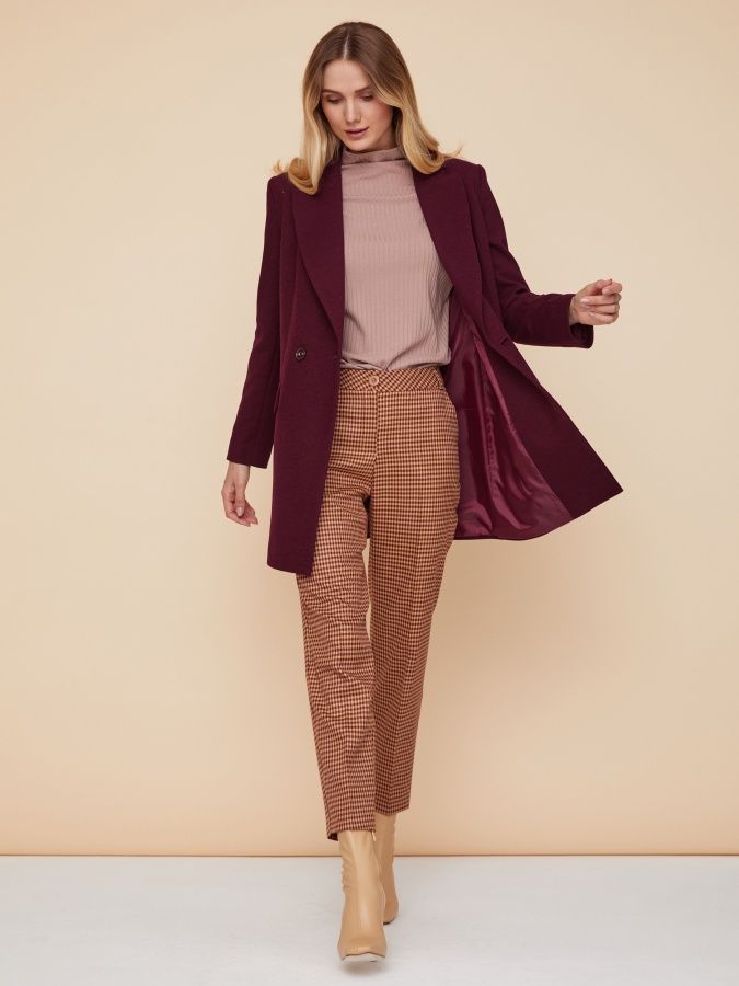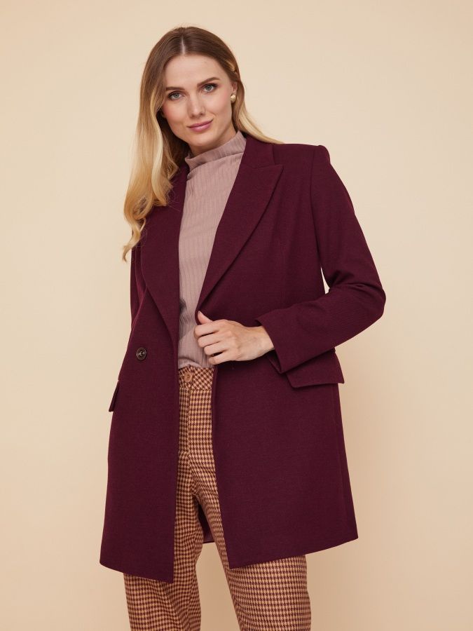 У длинного жакета винного оттенка на цветной подкладке есть все шансы стать фаворитом базового гардероба для прохладной осени. Выраженная линия плеч, свободная посадка с деликатным прилеганием в талии за счёт рельефных швов и вытачек, прорезные карманы с клапанами, широкий рукав. Жакет с такими параметрами с лёгкостью заменит плащ или легкое пальто. Для пошива двубортной модели с закругленными широким лацканами, использовали мягкое костюмное сукно. За счет своих эластичных свойств и высокой плотности материал способен поддерживать тепло и хорошо держит форму.