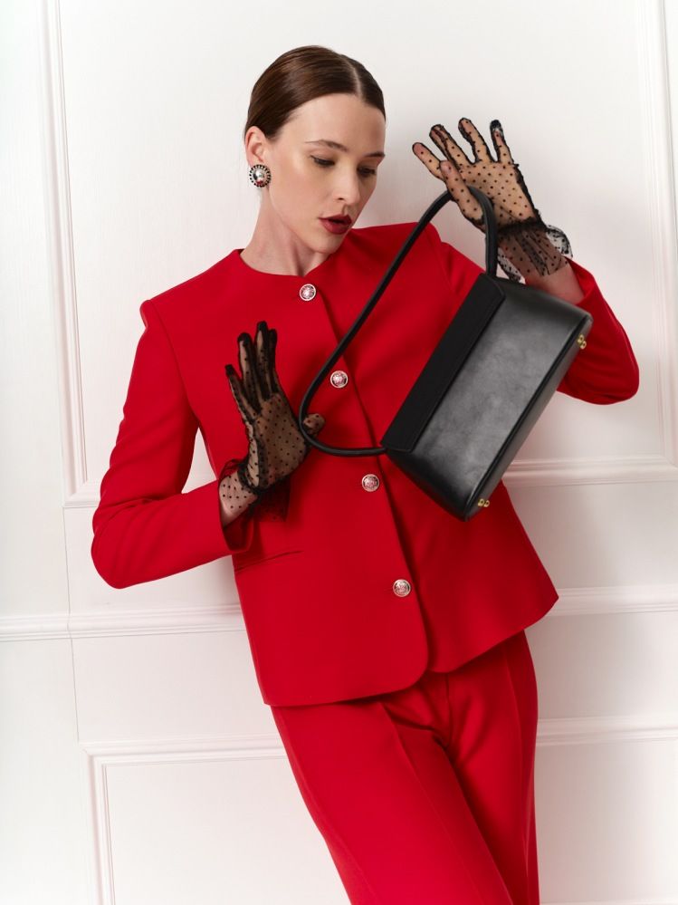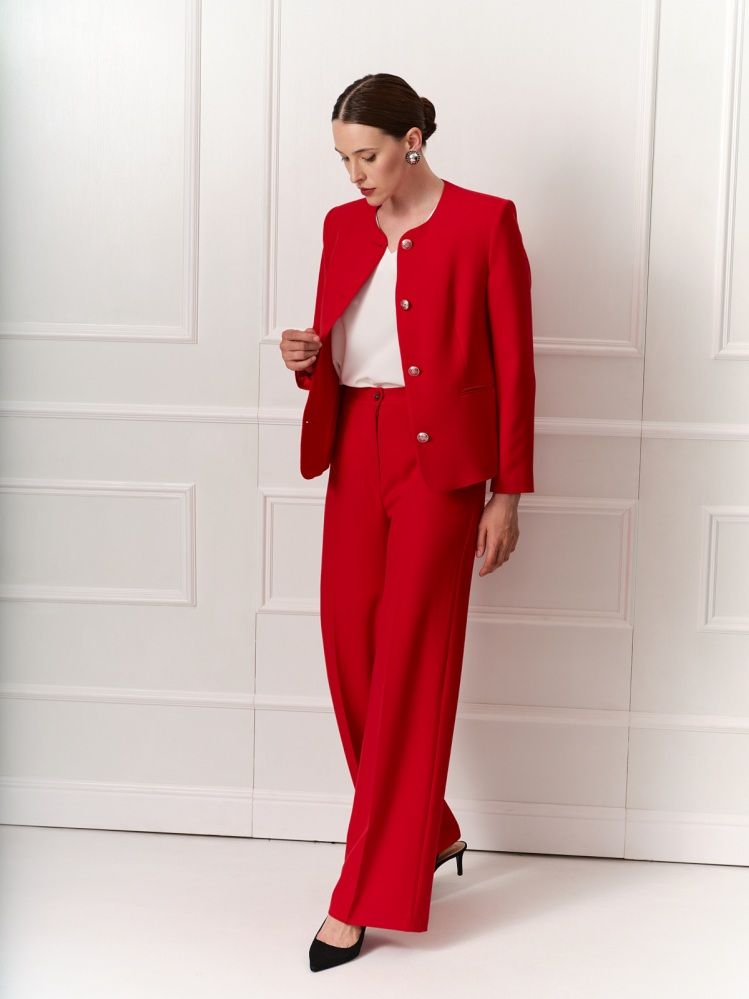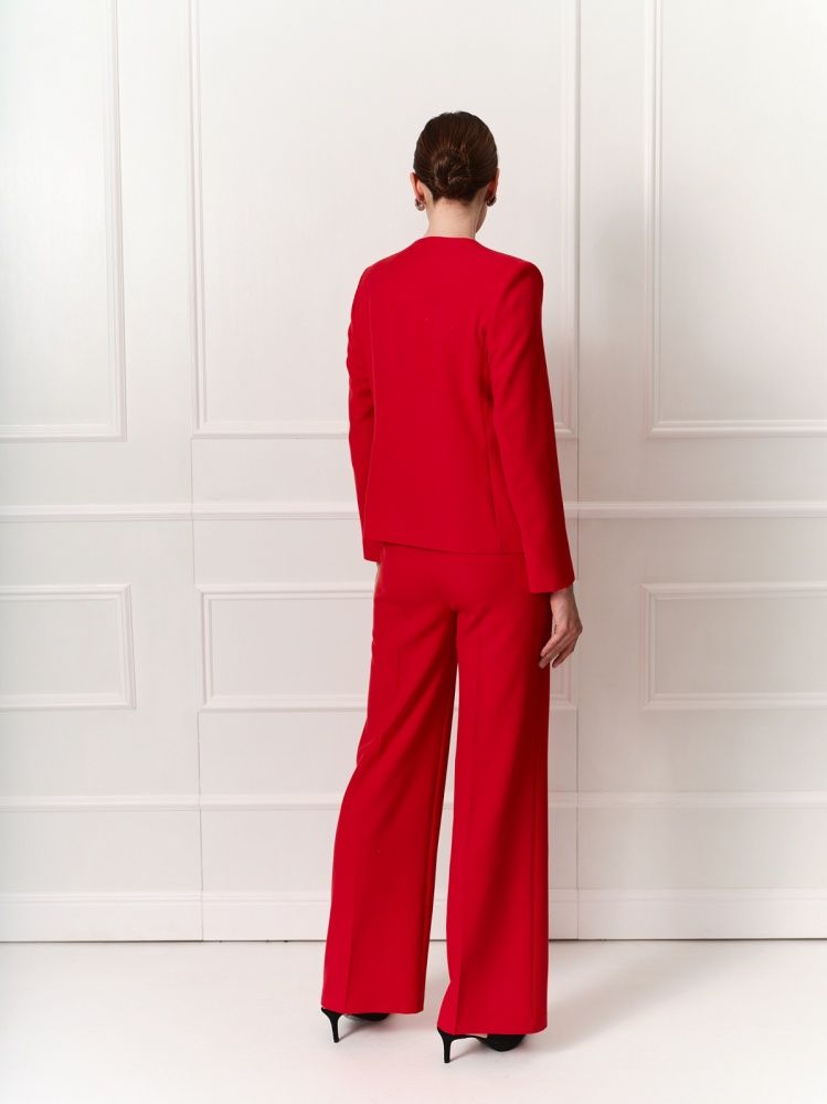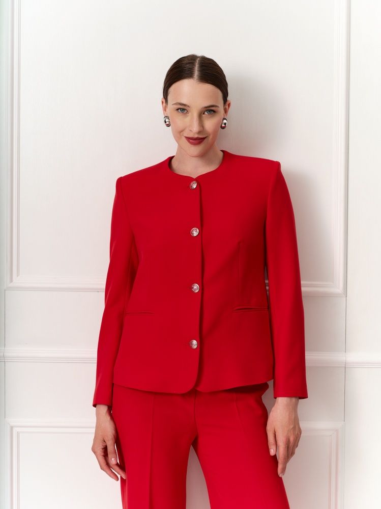 Жакет полуприлегающего силуэта с четко выраженной линией плеч и круглой горловиной привлекает внимание насыщенным красным оттенком. Прорезные карманы, эластичная подкладка. Тонкая костюмная ткань имеет легкую фактуру. В качестве декора - акцентные пуговицы с монограммой. На фото жакет представлен с брюками Б-2021 КРД(О4).