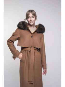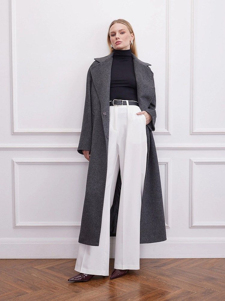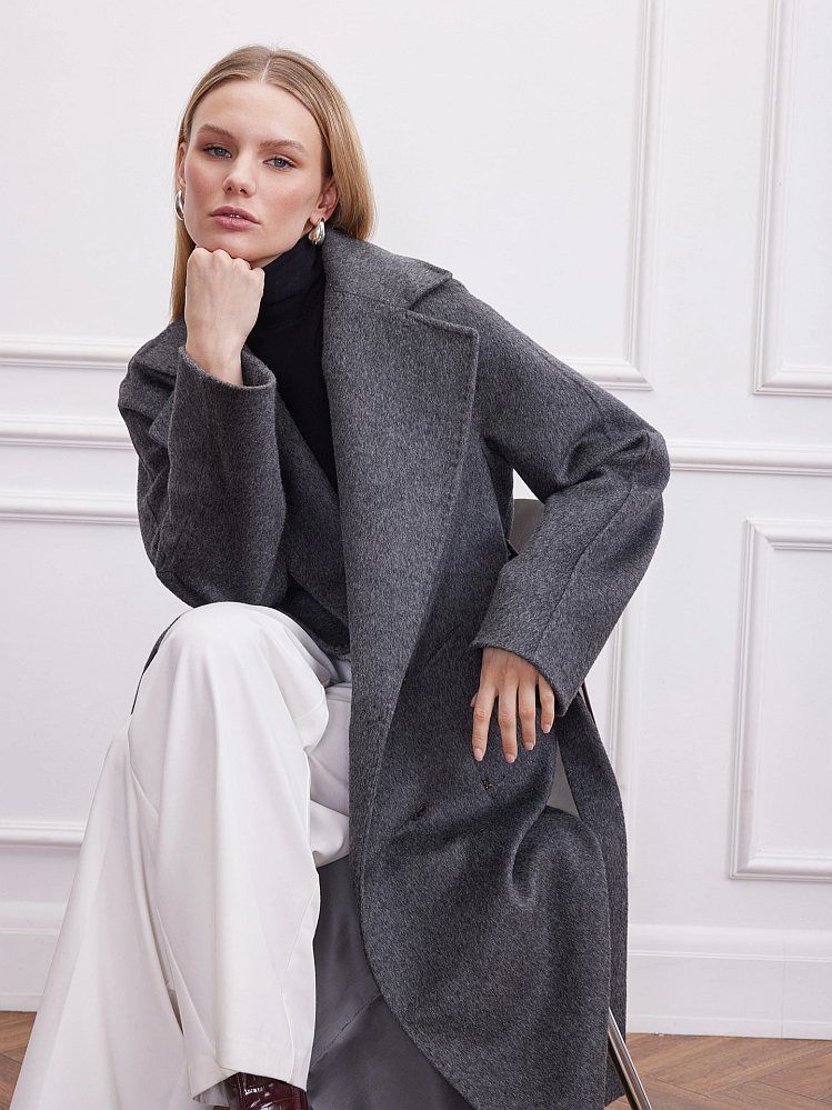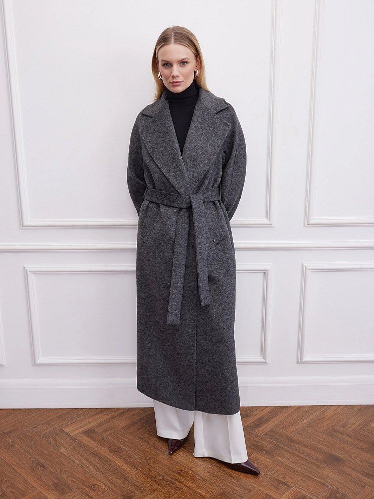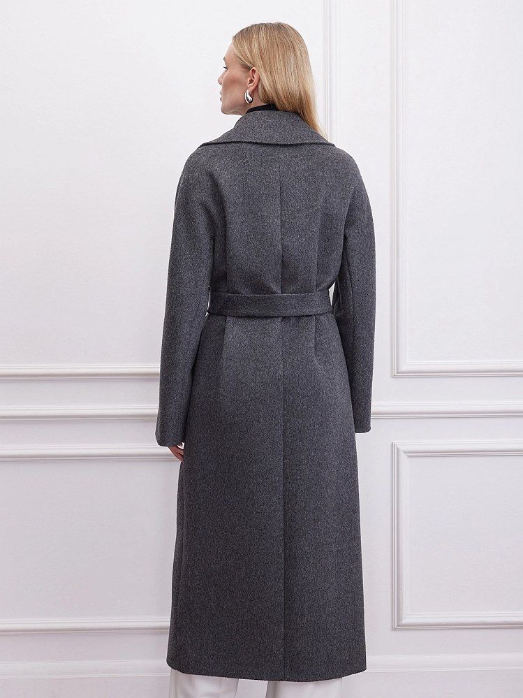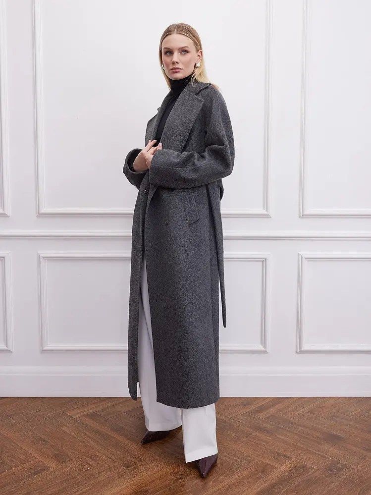Воротник «английский» и карманы в виде листочки с настрочными концами подчеркивают классические детали, в то время как двубортная застежка на две кнопки и завязывающийся пояс придают пальто завершенность и стиль.
